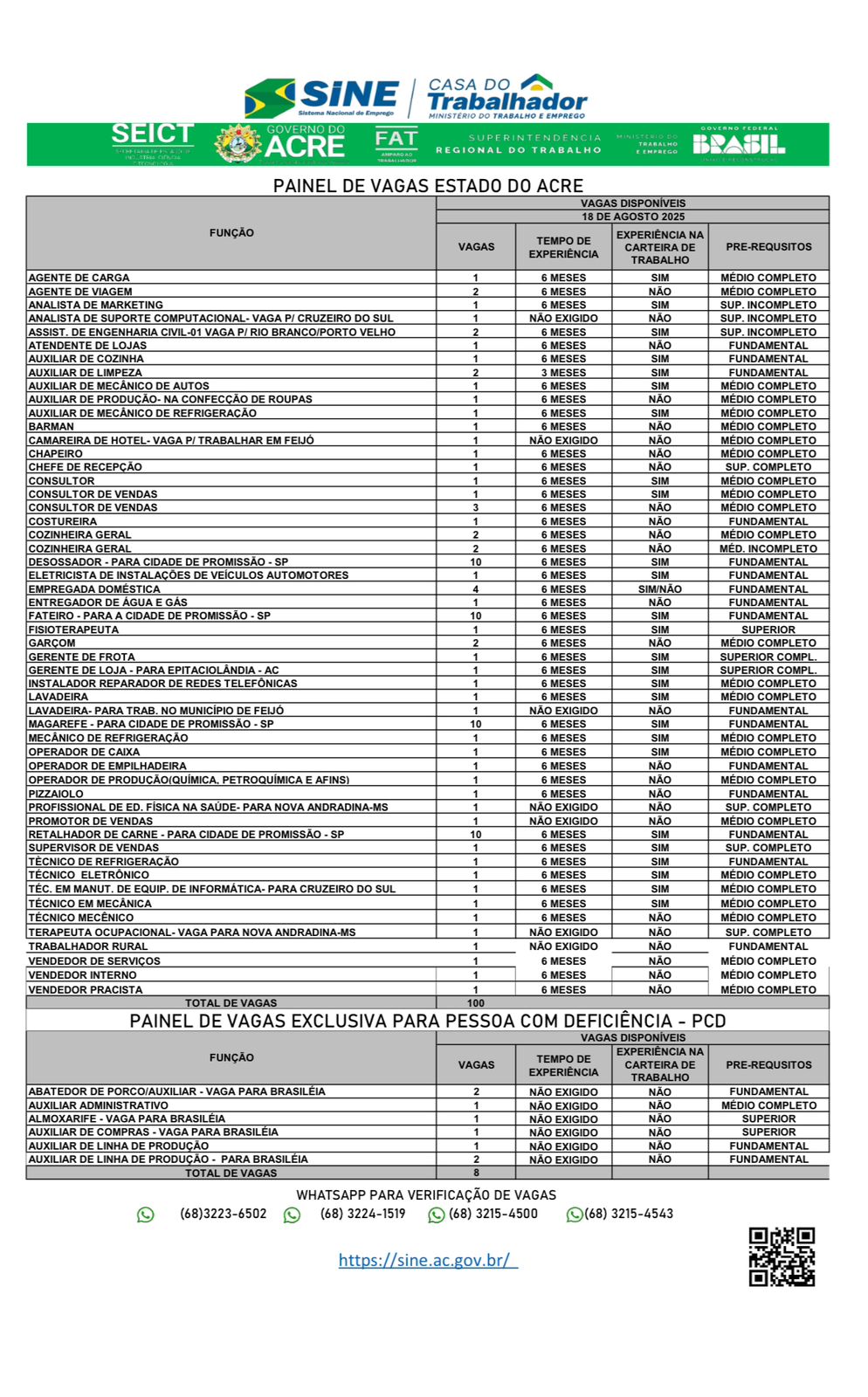 O Sistema Nacional de Emprego do Acre (Sine-AC) oferece 100 vagas de emprego para a população de Rio Branco nesta segunda-feira (18). Destas vagas, oito são destinadas exclusivamente às pessoas com deficiência.