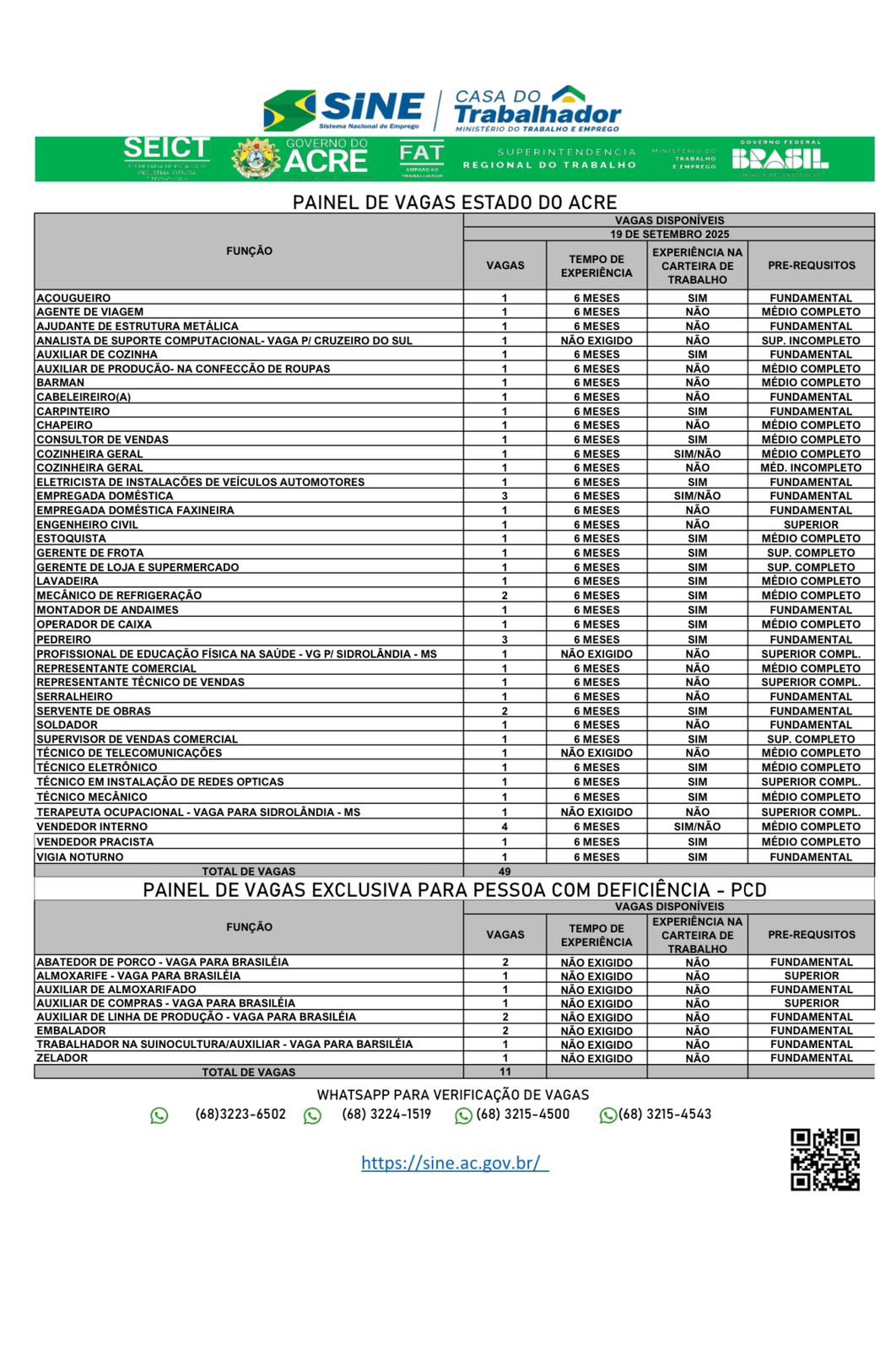 O Sistema Nacional de Emprego do Acre (Sine-AC) oferece 110 vagas de emprego para a população de Rio Branco nesta sexta-feira (19). Destas vagas, 11 são destinadas exclusivamente às pessoas com deficiência.