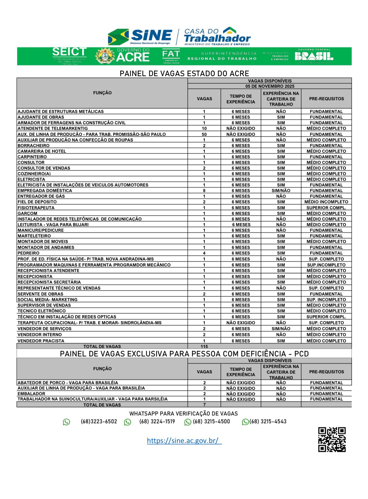 O Sistema Nacional de Emprego do Acre (Sine-AC) oferece 115 vagas de emprego para a população de Rio Branco nesta terça-feira (5). Destas vagas, sete são destinadas exclusivamente às pessoas com deficiência.