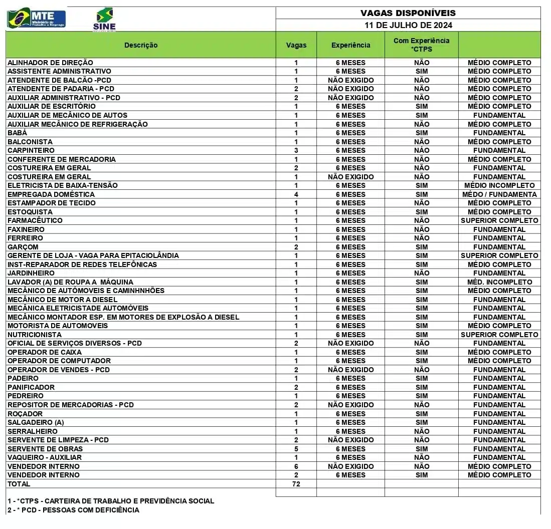 O Sistema Nacional de Emprego do Acre (Sine) oferece 72 vagas de emprego para a população de Rio Branco nesta quinta-feira (11).