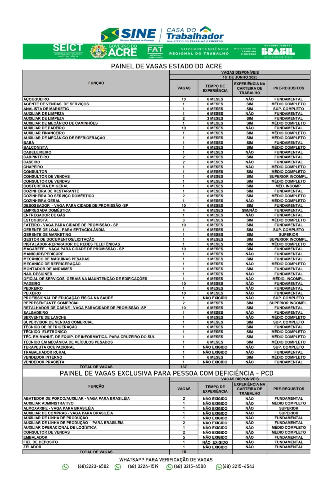 O Sistema Nacional de Emprego do Acre (Sine-AC) oferece 155 vagas de emprego para a população de Rio Branco nesta segunda-feira (16). Destas vagas, 18 são destinadas exclusivamente às pessoas com deficiência.