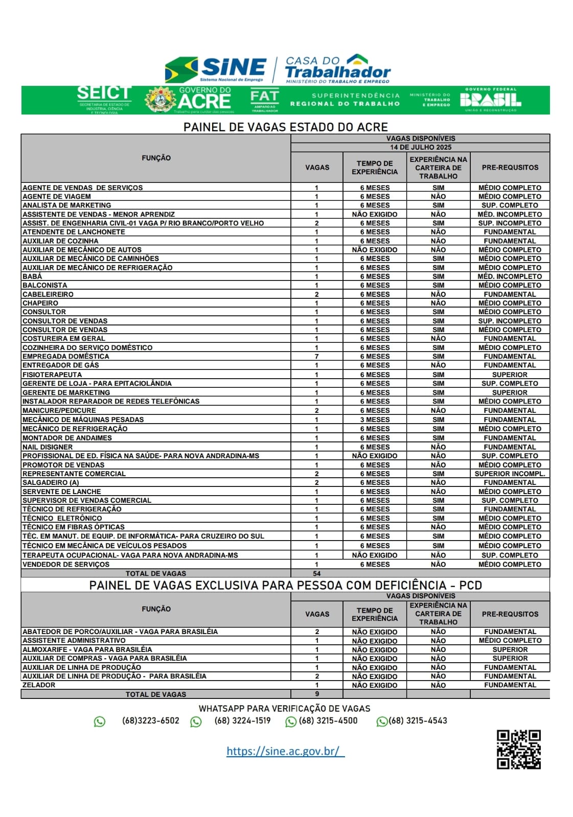 O Sistema Nacional de Emprego do Acre (Sine-AC) oferece 53 vagas de emprego para a população de Rio Branco nesta quinta-feira (26). Destas vagas, 9 são destinadas exclusivamente às pessoas com deficiência.