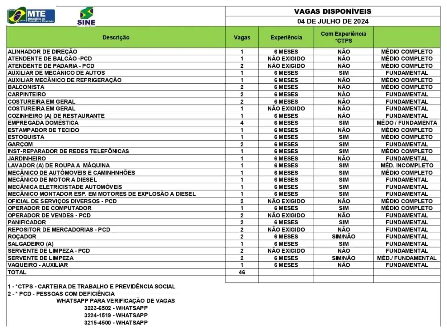 Os candidatos que ainda não possuem cadastro ou que precisam atualizá-lo devem entrar em contato com o Sine para regularizar sua situação. O cadastro pode ser feito via WhatsApp pelos números 3223-6502, 3224-1519 ou 3215-4500.