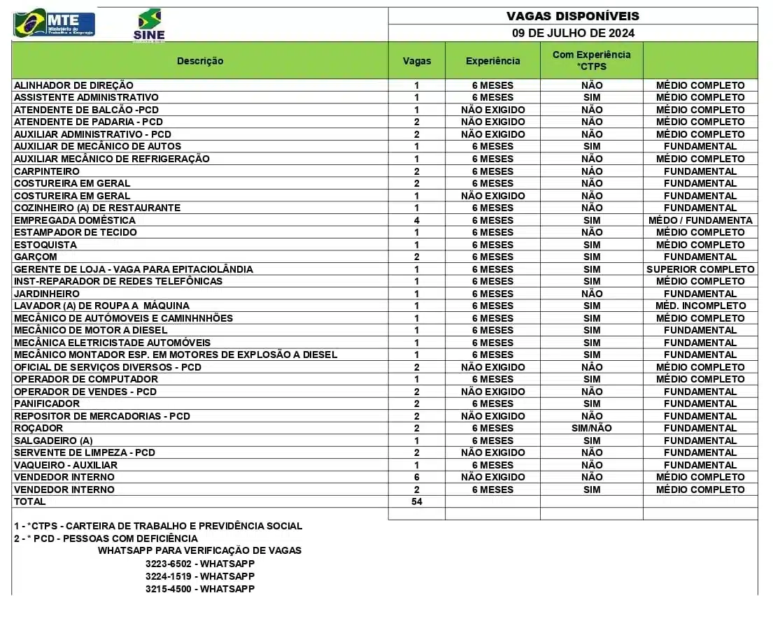 Os candidatos que ainda não possuem cadastro ou que precisam atualizá-lo devem entrar em contato com o Sine para regularizar sua situação. O cadastro pode ser feito via WhatsApp pelos números 3223-6502, 3224-1519 ou 3215-4500.