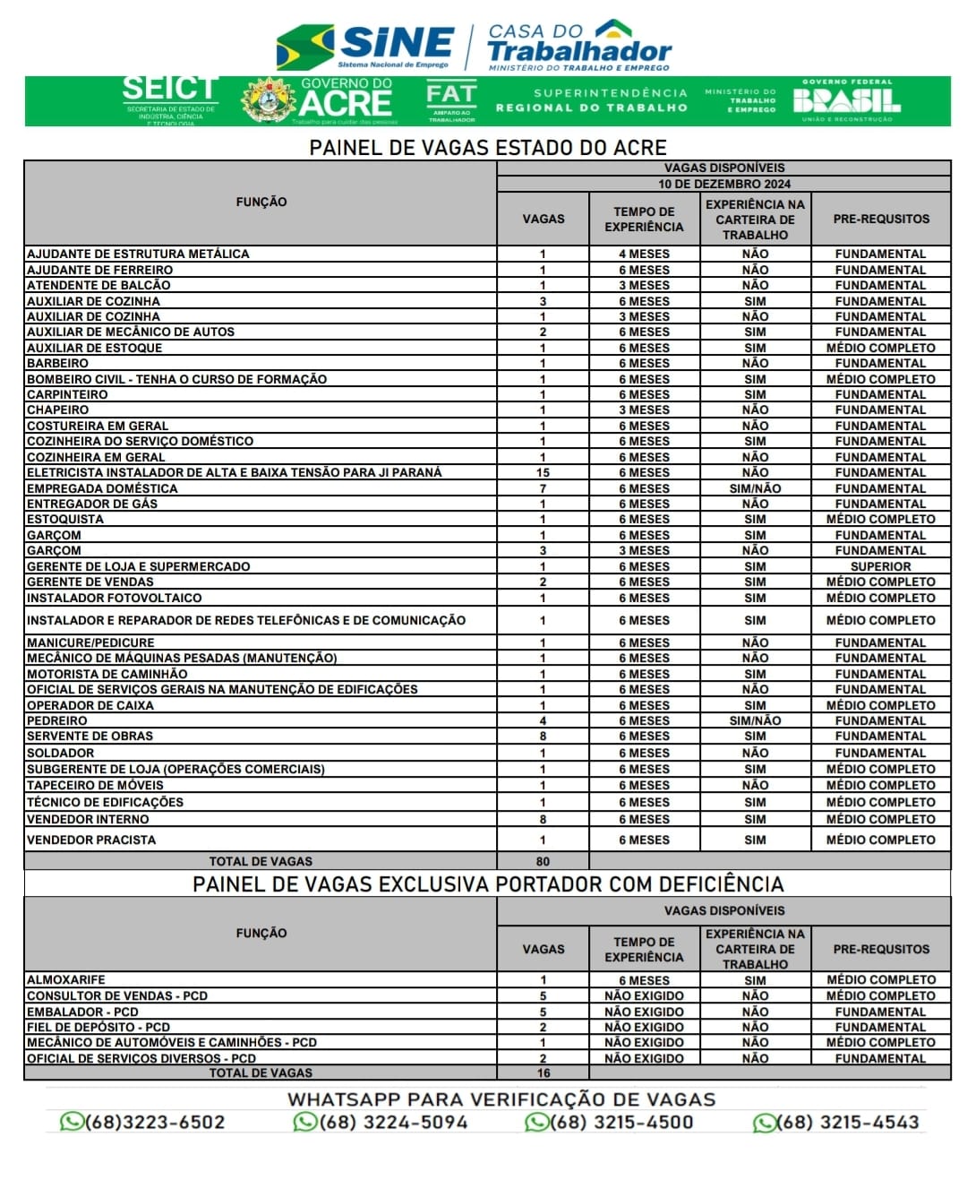 O Sistema Nacional de Emprego do Acre (Sine) oferece 96 vagas de emprego para a população de Rio Branco nesta quarta-feira (10). As oportunidades abrangem desde o ensino fundamental até o médio completo e são destinadas a pessoas com ou sem experiência prévia no mercado de trabalho. As inscrições podem ser realizadas por telefone, via WhatsApp, ou presencialmente.