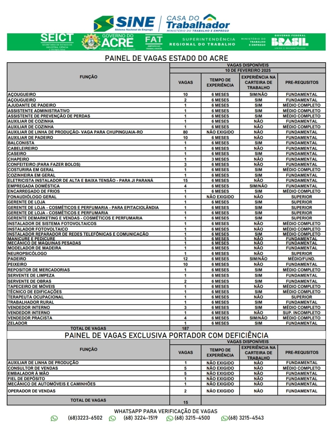 O Sistema Nacional de Emprego do Acre (Sine) oferece 202 vagas de emprego para a população de Rio Branco nesta segunda-feira (10). Destas vagas, 15 são destinadas exclusivamente às pessoas com deficiência.
