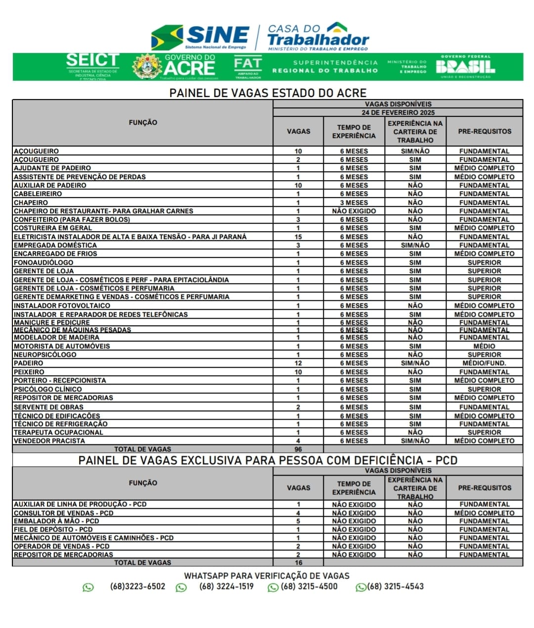 O Sistema Nacional de Emprego do Acre (Sine) oferece 96 vagas de emprego para a população de Rio Branco nesta segunda-feira (24). Destas vagas, 16 são destinadas exclusivamente às pessoas com deficiência.