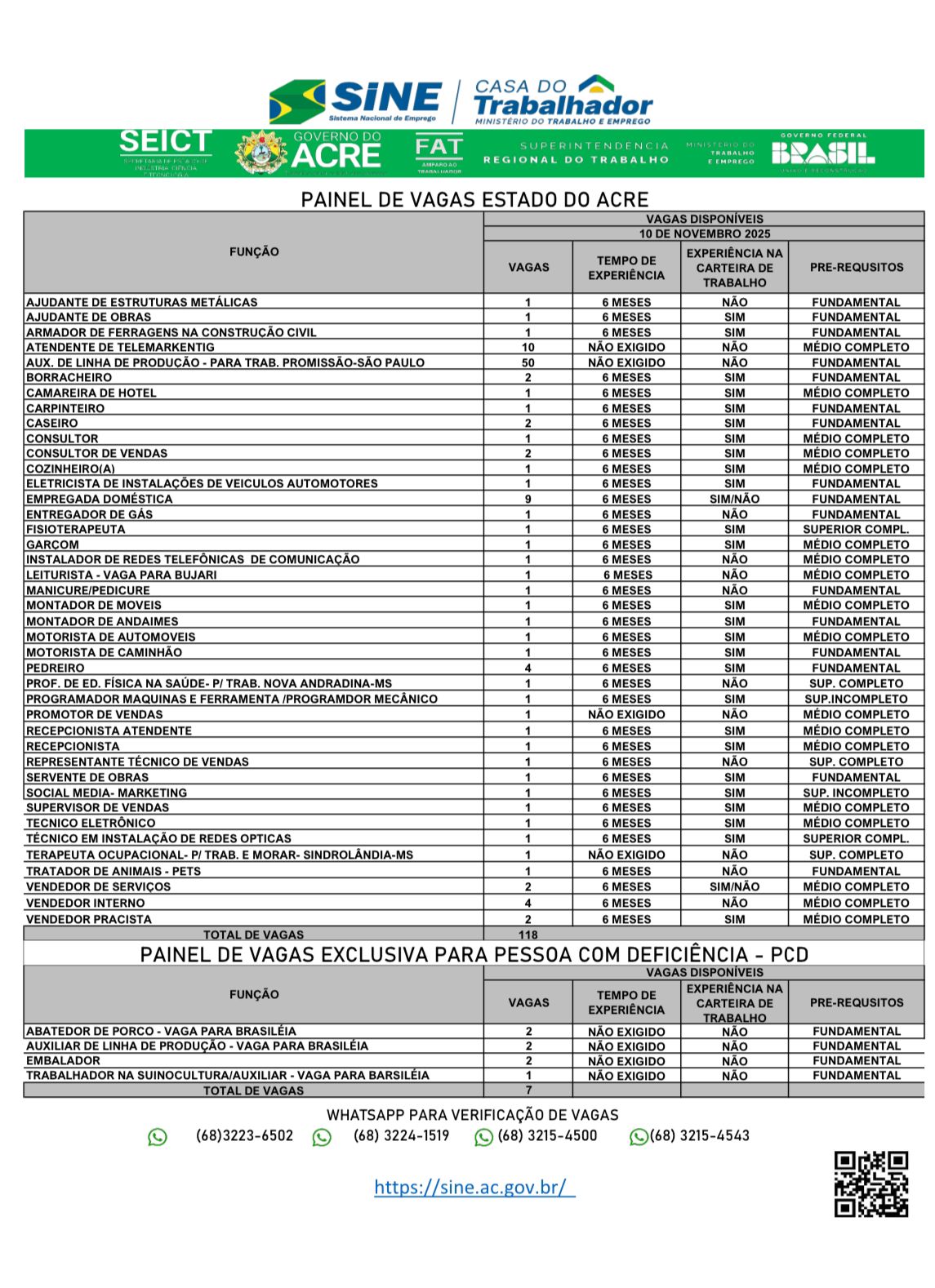 O Sistema Nacional de Emprego do Acre (Sine-AC) oferece 118 vagas de emprego para a população de Rio Branco nesta segunda-feira (10). Destas vagas, sete são destinadas exclusivamente às pessoas com deficiência.