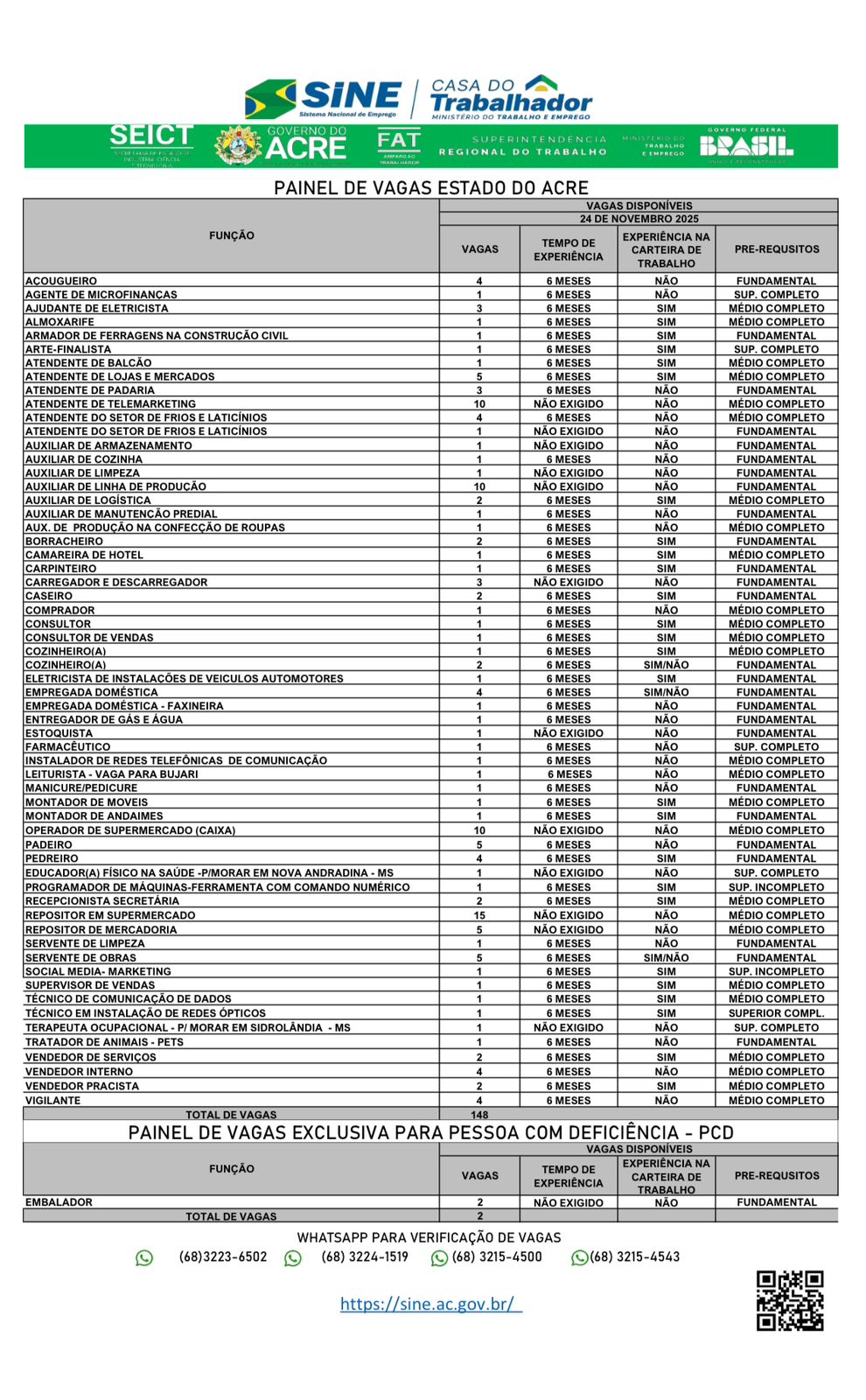 O Sistema Nacional de Emprego do Acre (Sine-AC) oferece 148 vagas de emprego para a população de Rio Branco nesta segunda-feira (24). Destas vagas, duas são destinadas exclusivamente às pessoas com deficiência.