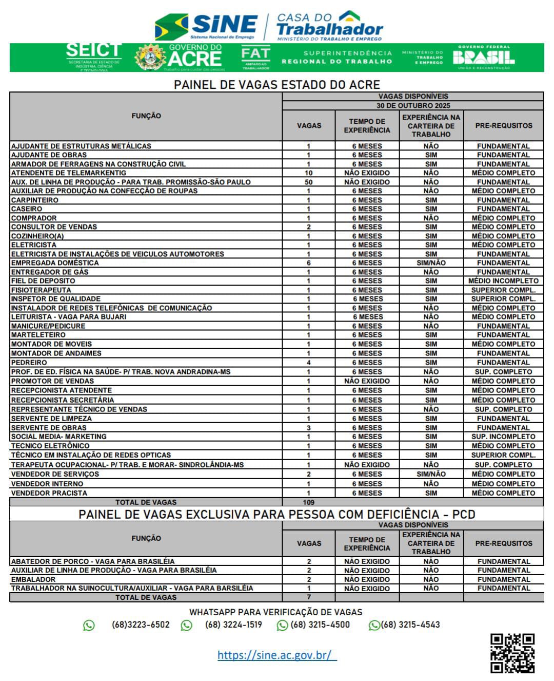 O Sistema Nacional de Emprego do Acre (Sine-AC) oferece 116 vagas de emprego para a população de Rio Branco nesta quinta-feira (30). Destas vagas, 7 são destinadas exclusivamente às pessoas com deficiência.