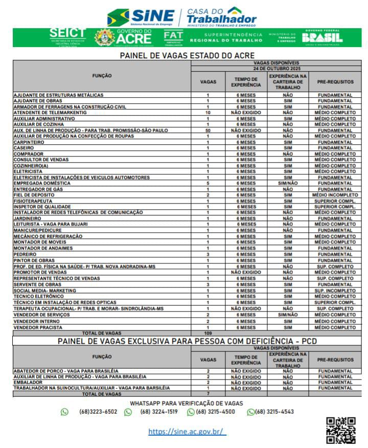 O Sistema Nacional de Emprego do Acre (Sine-AC) oferece 116 vagas de emprego para a população de Rio Branco nesta sexta-feira (24). Destas vagas, 7 são destinadas exclusivamente às pessoas com deficiência.