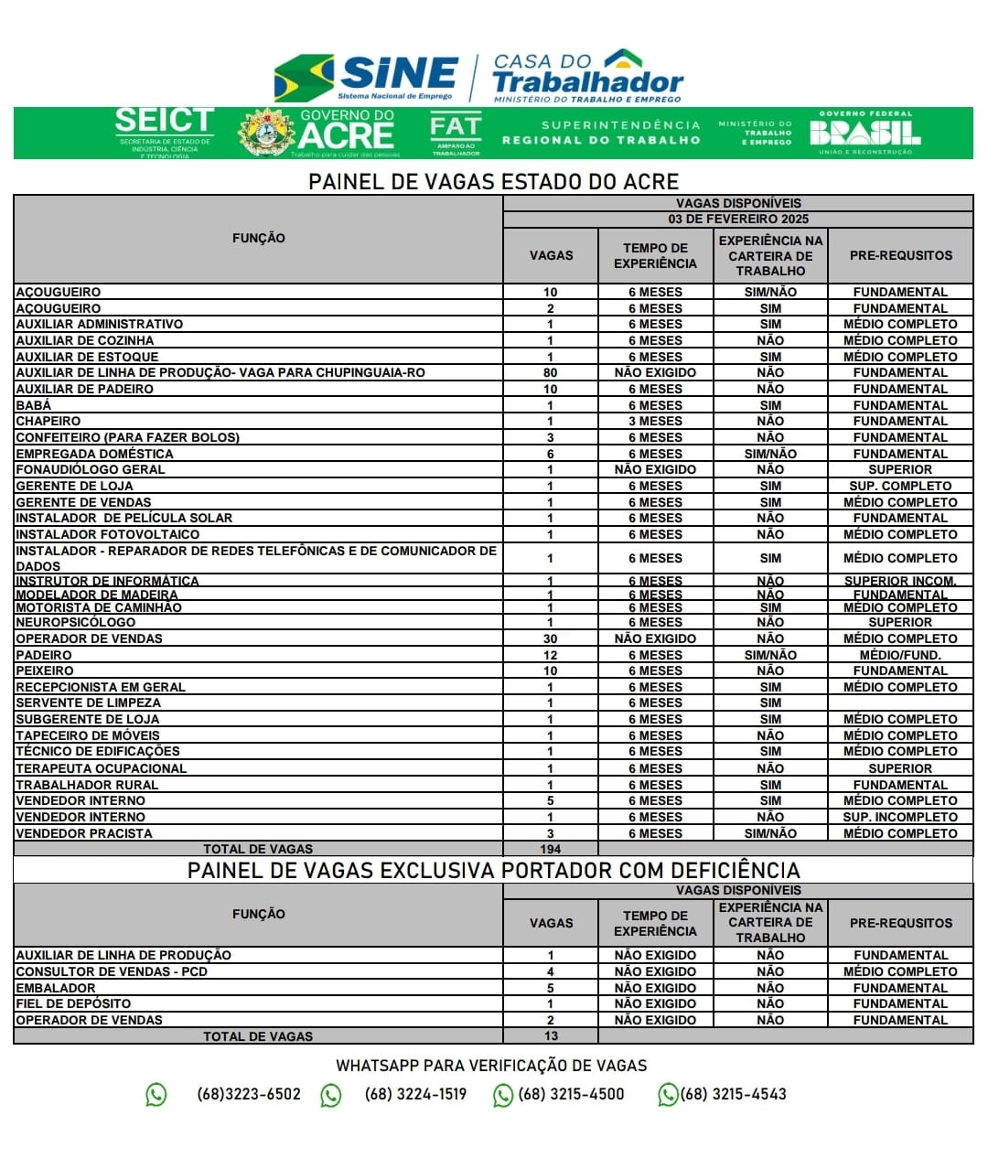 O Sistema Nacional de Emprego do Acre (Sine) oferece 207 vagas de emprego para a população de Rio Branco nesta segunda-feira (3). Destas vagas, 13 são destinadas exclusivamente às pessoas portadoras de deficiência.