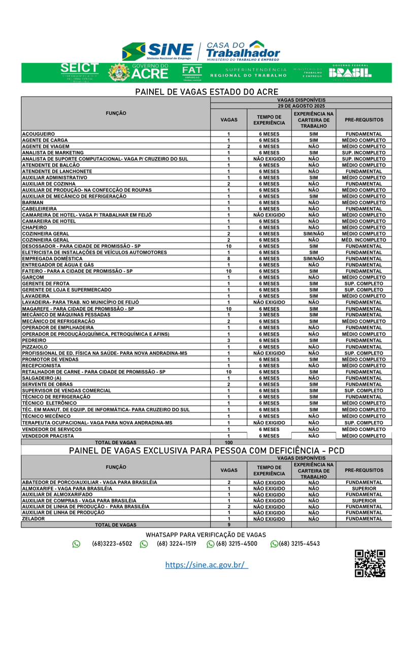 Sine Acre oferta 100 vagas de emprego nesta sexta-feira; confira painel