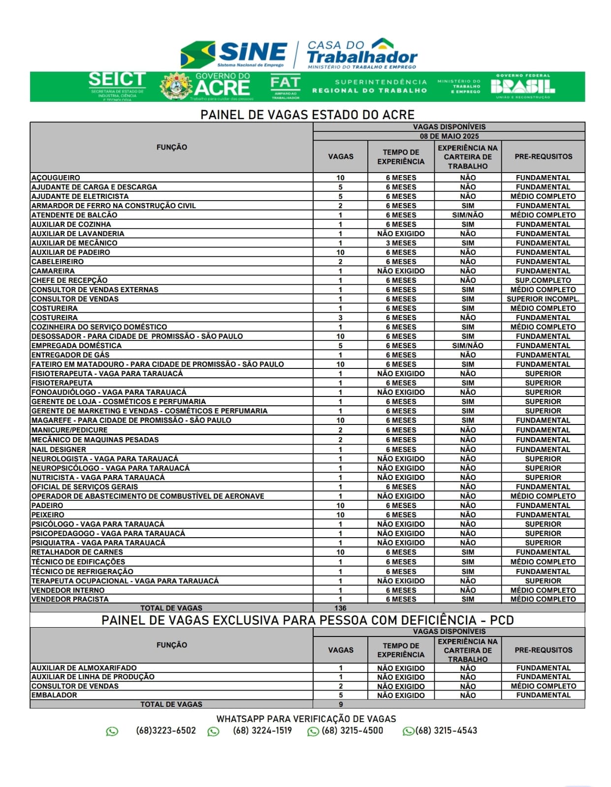 O Sistema Nacional de Emprego do Acre (Sine-AC) oferece 145 vagas de emprego para a população de Rio Branco nesta quinta-feira (8). Destas vagas, 9 são destinadas exclusivamente às pessoas com deficiência.