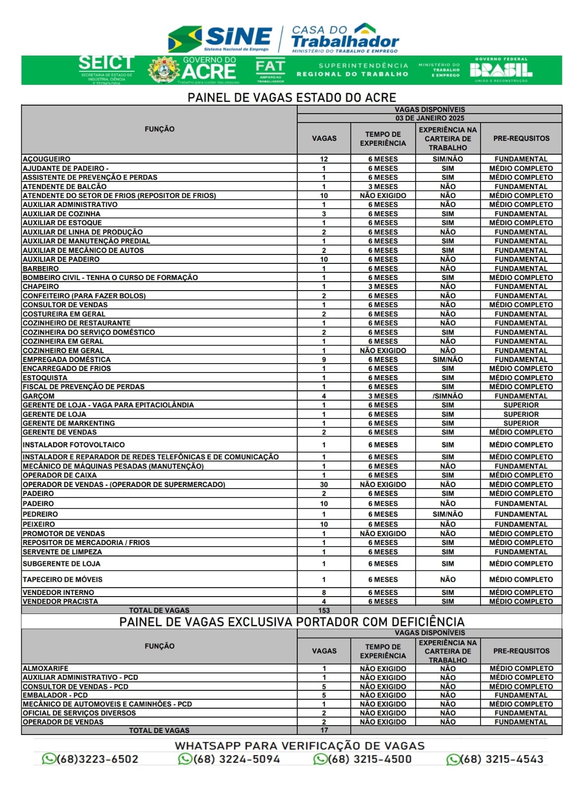 O Sistema Nacional de Emprego do Acre (Sine) oferece 170 vagas de emprego para a população de Rio Branco nesta sexta-feira (3). Destas vagas, 17 são destinadas exclusivamente a pessoas portadoras de deficiência.