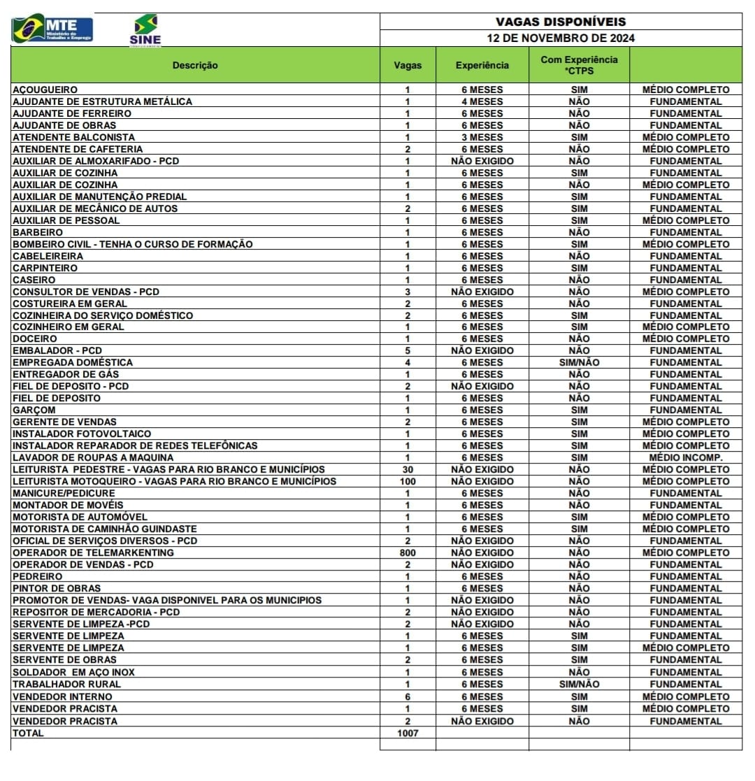 O Sistema Nacional de Emprego do Acre (Sine) oferece 1007 vagas de emprego para a população de Rio Branco nesta terça-feira (12). As oportunidades abrangem desde o ensino fundamental até o médio completo e são destinadas a pessoas com ou sem experiência prévia no mercado de trabalho. As inscrições podem ser realizadas por telefone, via WhatsApp, ou presencialmente.