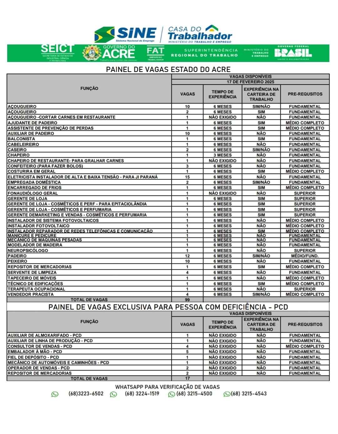 Os candidatos que ainda não possuem cadastro ou que precisam atualizá-lo devem entrar em contato com o Sine para regularizar sua situação. O cadastro pode ser feito via WhatsApp pelos números 3223-6502, 3224-1519 ou 3215-4500.