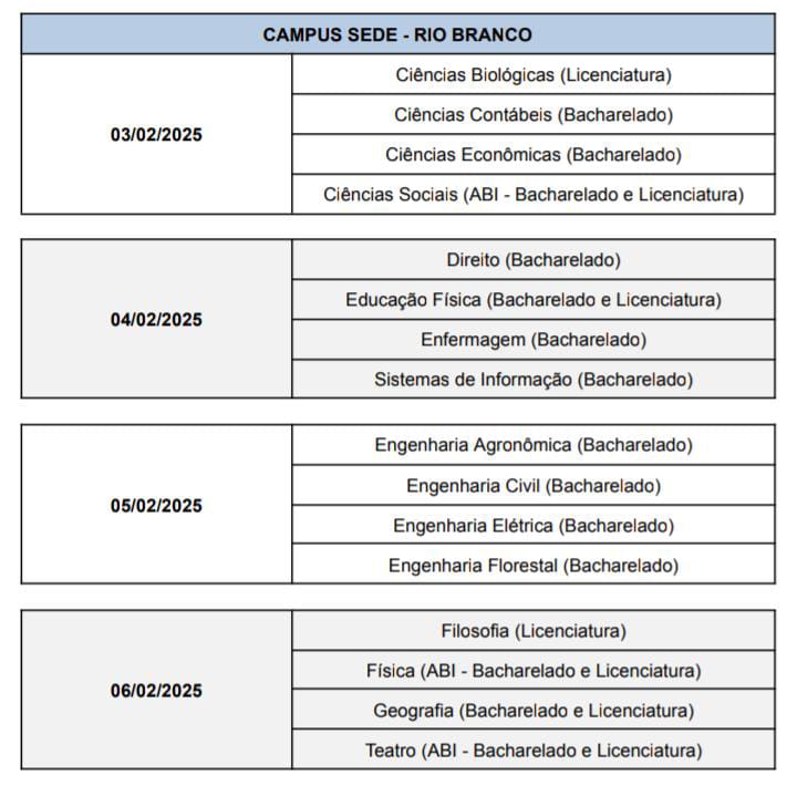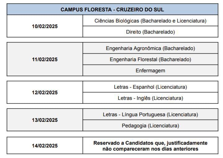 As matrículas para os ingressantes na Ufac em 2025 estão abertas. A segunda fase, que é a presencial, acontece a partir desta segunda-feira (03), e vai até o dia 14 de fevereiro. O cronograma divulgado pela Ufac prevê os dias e horários para levar a documentação, de acordo com os cursos. Essas datas são destinadas exclusivamente para os alunos da primeira chamada do Sisu.