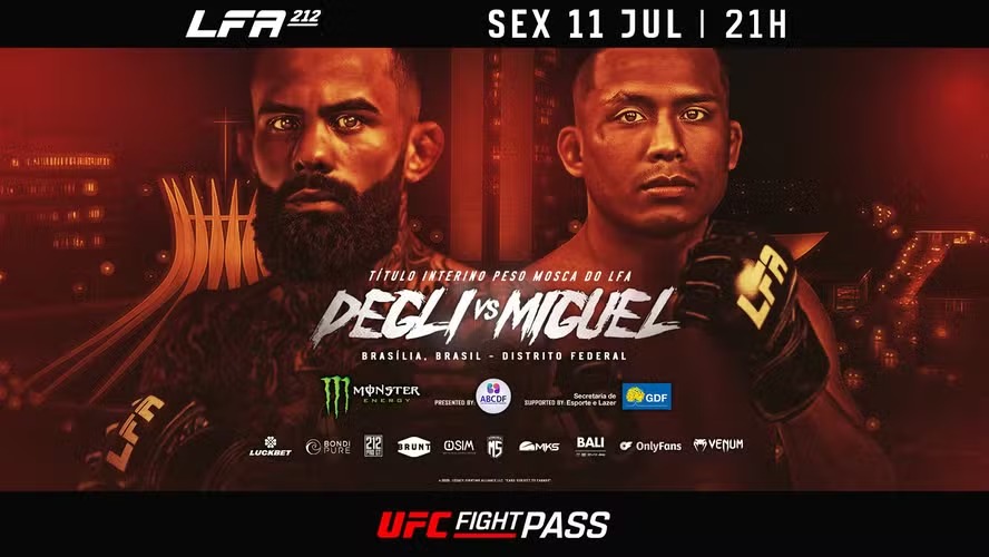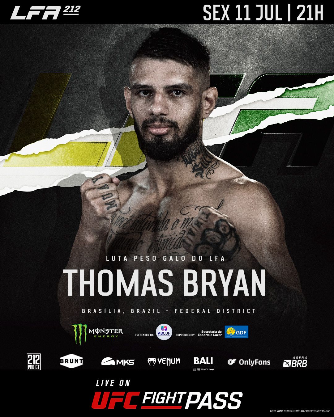 Além da luta de Thomas Bryan, o card do LFA 212 terá como destaque o confronto entre o brasileiro Marcos Degli, conhecido como “Tailandês”, e o peruano Oscar Miguel, valendo o cinturão interino dos pesos-moscas. Degli chega embalado por 10 vitórias consecutivas — quatro delas dentro do próprio LFA. Já Oscar Miguel ostenta uma sequência de 13 triunfos.