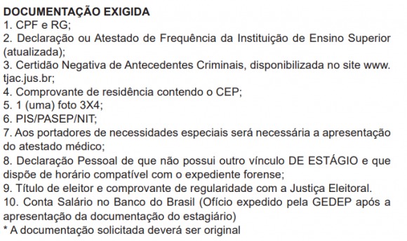 Todos deverão enviar a documentação exigida para o e-mail gedep@tjac.jus.br, no prazo de cinco dias úteis. Vale destacar que a entrega de documentos para realização de cadastro no Tribunal é de grande importância para garantir a comunicação assertiva e agilizar o contato com os candidatos à medida que surgirem vagas para lotação dos estagiários nas unidades.