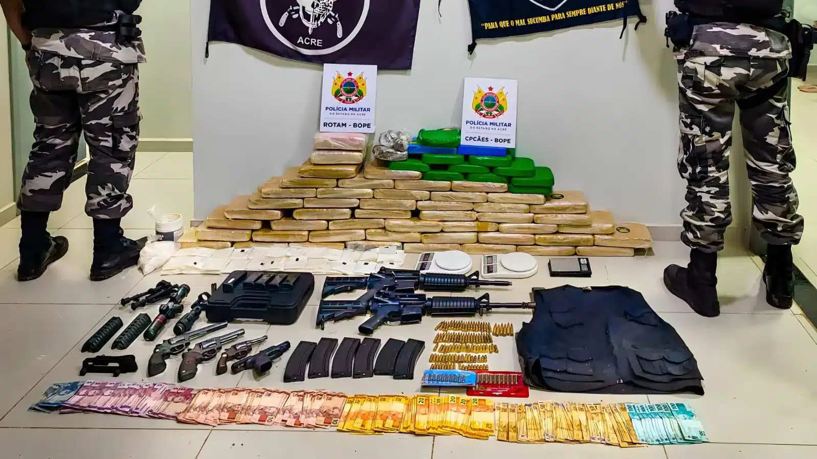 Uma operação policial resultou na apreensão de seis armas de fogo, munições de diversos calibres, mais de 60 quilos de entorpecentes e mais de sete mil reais em dinheiro, além de peças de fardas militares na noite deste sábado (06), no Andirá. A ação foi realizada pelos policiais militares da Companhia de Rondas Ostensivas Táticas Móveis (Rotam), do Batalhão de Operações Especiais (Bope), e  da Polícia Militar do Acre (PMAC).