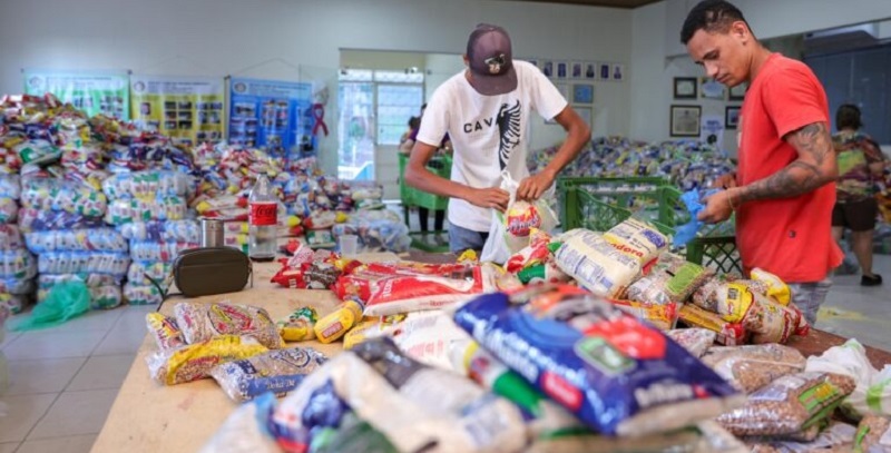A Casa da Amizade, na Marechal Deodoro, no Centro, está sendo o ponto principal de armazenamento dos alimentos, onde equipes de voluntários já estão organizando a separação em pilhas de arroz, feijão, farinha, óleo, macarrão, açúcar, trigo, milharina e outros.
