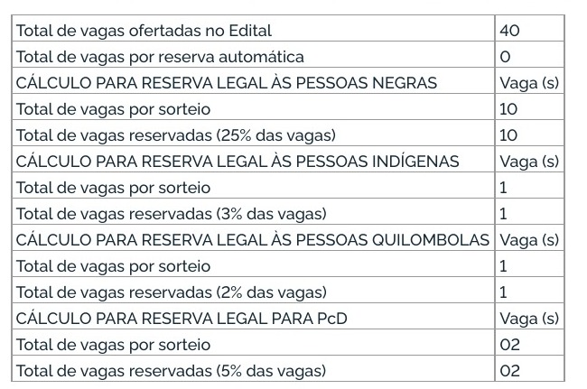 Há reserva de vagas para pessoas com deficiência, candidatos negros, indígenas e quilombolas, conforme a legislação vigente. O sorteio público para definição das áreas contempladas com essas cotas será transmitido pelo canal UfacTV no YouTube.