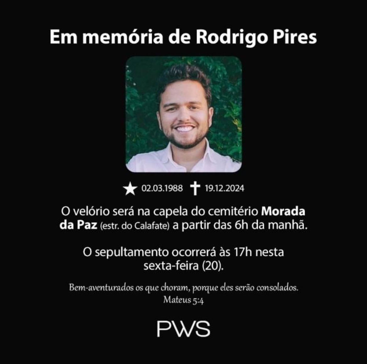 Velório de Rodrigo Pires acontece no cemitério Morada da Paz nesta sexta-feira, Rodrigo Pires era admirado por sua dedicação ao trabalho e por sua contribuição ao desenvolvimento do estado.