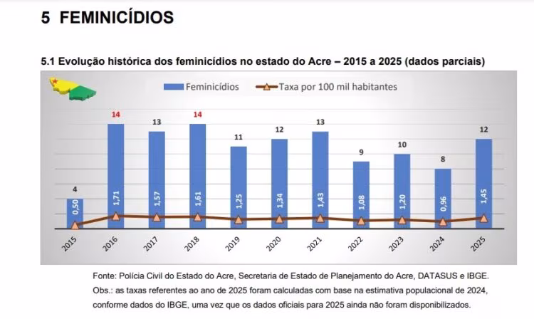 Os números reforçam o alerta. De janeiro a dezembro deste ano, o Acre já registrou 5 mil ocorrências de violência doméstica, além de 13 feminicídios consumados. Se mais uma mulher morrer pelo mesmo motivo, 2025 empatará com os piores anos da série histórica, 2016 e 2018, cada um com 14 mortes.]